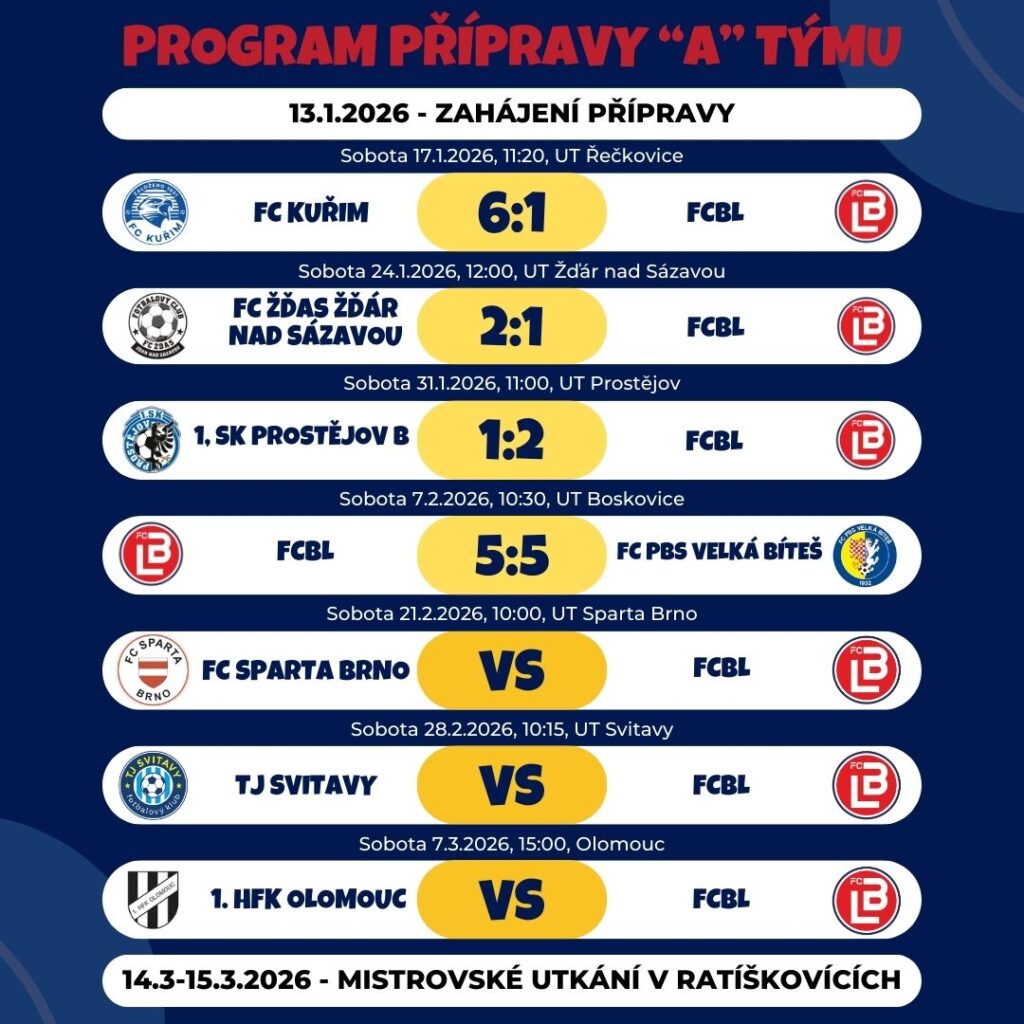 🔜⚽️ Už tento víkend vás srdečně zveme na jediné domácí přípravné utkání této přípravy. Zítra (tj. v sobotu 7. února 2026) od 10:30 přivítáme na domácí půdě FC PBS Velkou Bíteš, účastníka 4. ligy.![]()