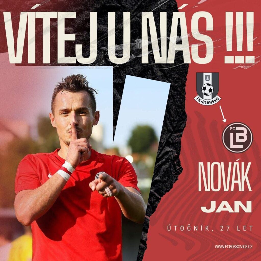 Po sezoně a půl strávené v FK Blansko se k nám vrací útočník Jan Novák! Jenda u nás v klubu působil do února 2024, poté přestoupil do Blanska, kde za sezonu a půl stihl za „B“ tým vstřelit 8 branek ve 22 utkáních a za „A“ tým ve 3. lize naskočil do 31 utkáních, ve kterých vstřelil 3 branky.
